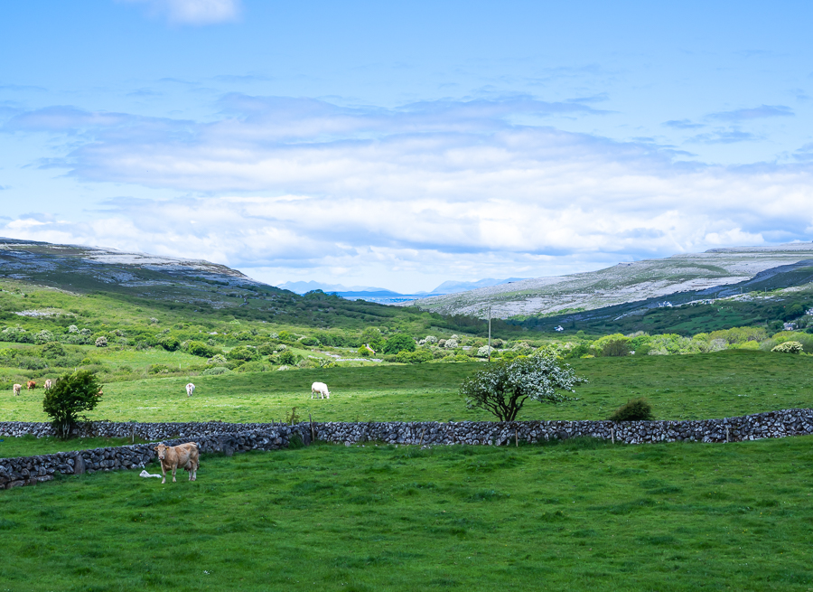From Hanne’s Cottage you have a stunning view down Caher Valley, the Burren mountains, Galway Bay and on a clear day all the way to Connemara.